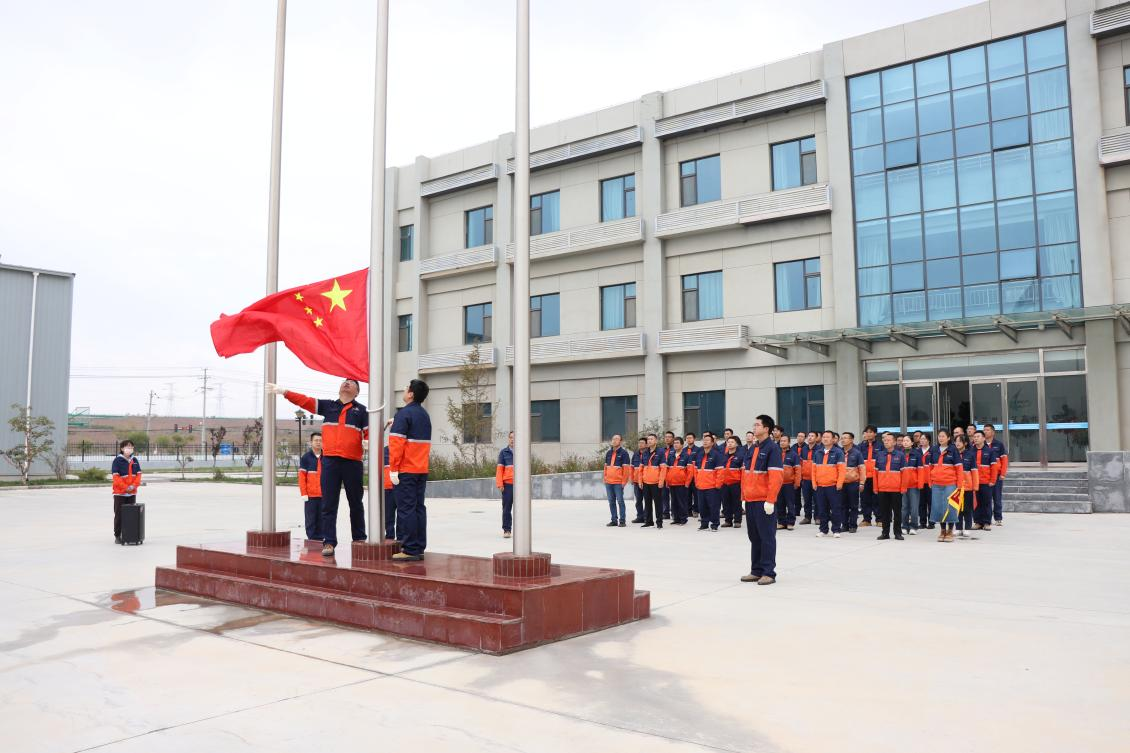 9月30日,,,化工热电公司广场上,,,五名旗头仰面阔步,,,全体职工庄重肃立,,,陪同嘹亮的国歌,,,目送五星红旗冉冉升起,,,迎风飘扬。。
