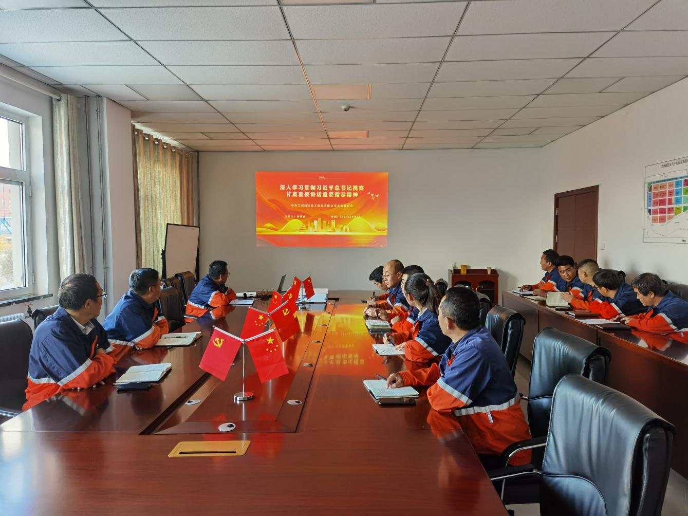 10月14日下昼,,, ,兰州新区化工热电有限公司在第一聚会室组织召开专题学习聚会,,, ,深入学习贯彻习近平总书记视察甘肃主要讲话和指示精神,,, ,热电公司支部副书记、副总司理李在健主持聚会,,, ,支部书记、总司理仲继业出席聚会并讲话。。。。。