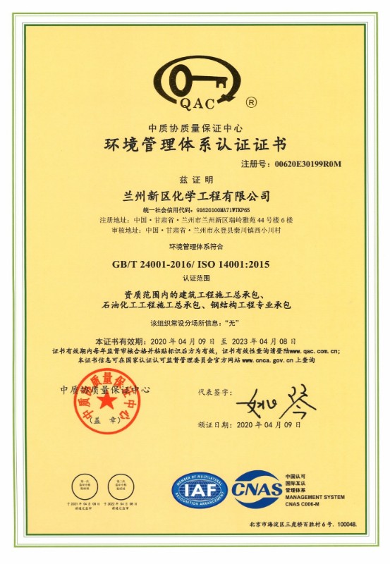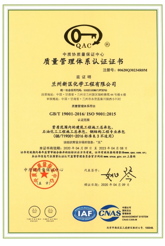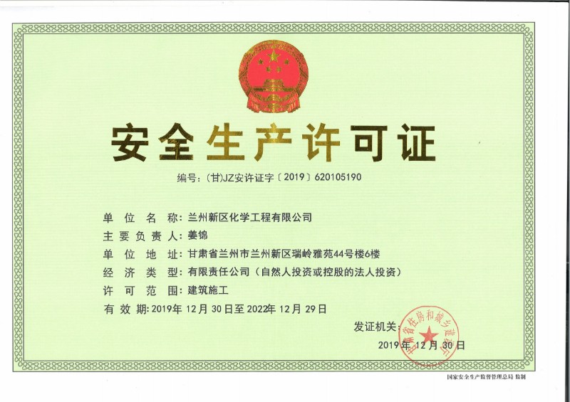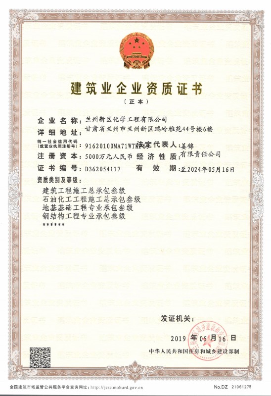 兰州新区化学工程有限公司现在已取得了石油化工总承包三级、修建工程总承包三级、钢结构专业承包三级、地基处置惩罚专项承包三级资质。。