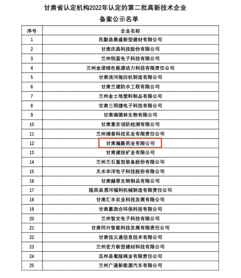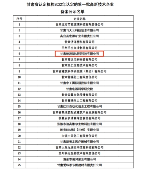 10月18日, ,,,,科技部火炬中心宣布了“关于对甘肃省认定机构2022年认定的第一批、第二批高新手艺企业举行备案公示的通知”, ,,,,其中专精特新化工工业孵化器内的甘肃峻茂新质料科技有限公司和甘肃瀚聚药业有限公司2家入驻企业被乐成认定为2022年高新手艺企业。。。